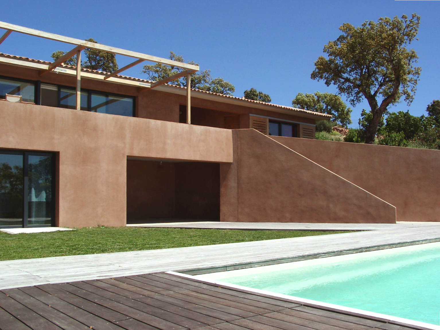 Le choix de la tuile canale pour la toiture, les murs massifs, la sobriété des volumes, l’implantation de la construction sur le terrain, permettent l’intégration du projet dans un paysage littoral remarquable.